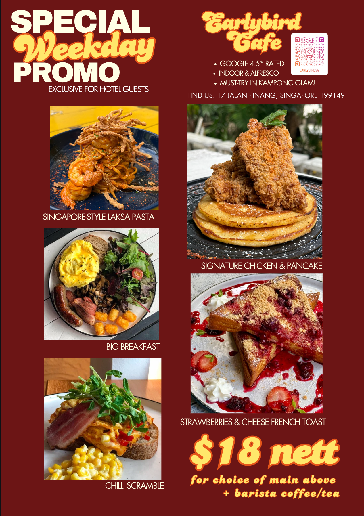 Indulge in a delightful fusion of flavors at Earlybird Café, where all-day breakfast meets innovative cuisine. Savor local favorites like Singapore-style Laksa Pasta or enjoy a classic Pancakes & Chicken—there’s something to satisfy every craving.